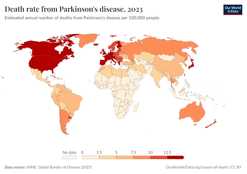 IHME, Global Burden of Disease (2024) – with minor processing by Our World in Data. “Death rate from Parkinson's disease” [dataset]. IHME, Global Burden of Disease, “Global Burden of Disease - Deaths and DALYs” [original data]. Retrieved January 8, 2026 from https://multi-dim-redirects-index.owid.pages.dev/grapher/death-rate-from-parkinsons-disease-gbd