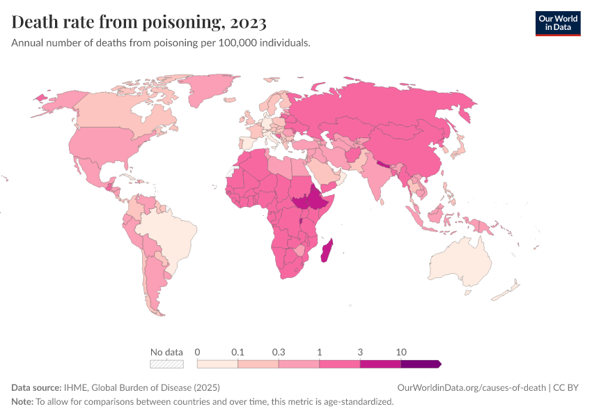 IHME, Global Burden of Disease (2024) – with minor processing by Our World in Data. “Death rate from poisoning” [dataset]. IHME, Global Burden of Disease, “Global Burden of Disease - Deaths and DALYs” [original data]. Retrieved January 8, 2026 from https://multi-dim-redirects-index.owid.pages.dev/grapher/death-rate-from-poisoning
