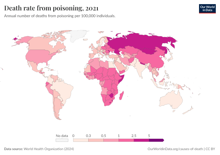 World Health Organization (2024) – with major processing by Our World in Data. “Death rate from poisoning” [dataset]. World Health Organization, “Global Health Estimates” [original data]. Retrieved January 8, 2026 from https://multi-dim-redirects-index.owid.pages.dev/grapher/death-rate-from-poisoning-ghe