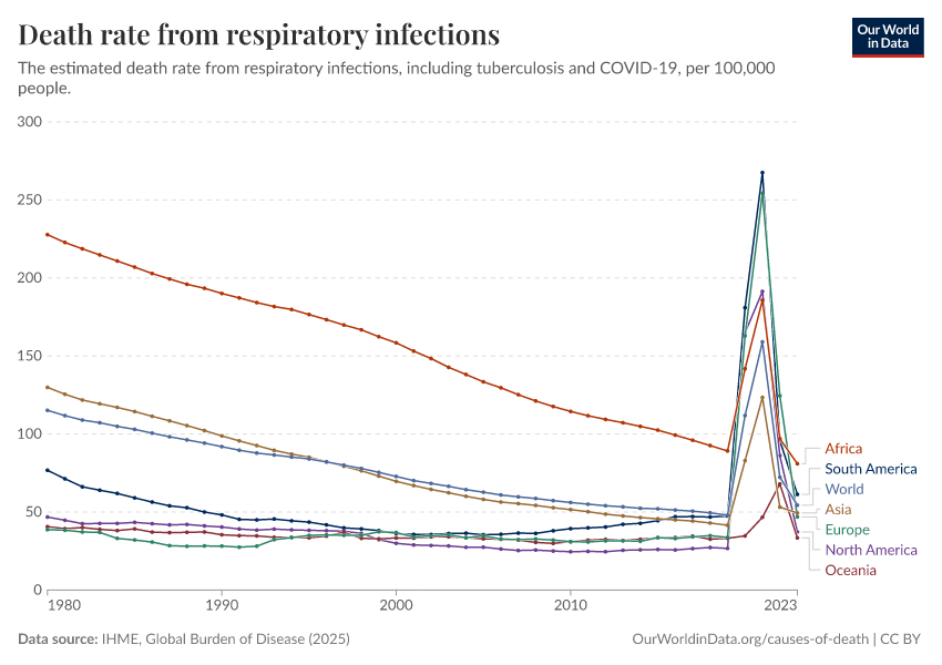 IHME, Global Burden of Disease (2024) – with minor processing by Our World in Data. “Death rate from respiratory infections” [dataset]. IHME, Global Burden of Disease, “Global Burden of Disease - Deaths and DALYs” [original data]. Retrieved January 8, 2026 from https://multi-dim-redirects-index.owid.pages.dev/grapher/death-rate-from-respiratory-infections-gbd