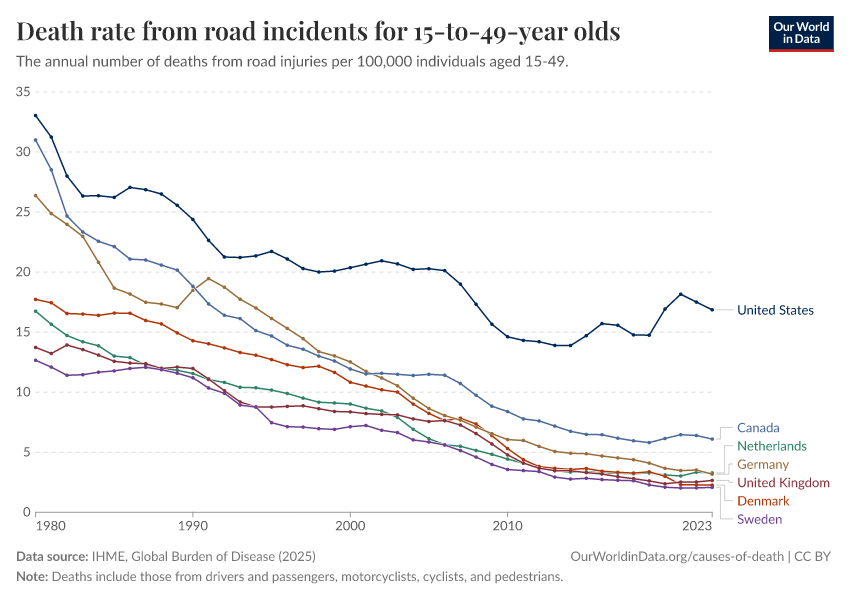IHME, Global Burden of Disease (2024) – with minor processing by Our World in Data. “Death rate from road incidents for 15-to-49-year olds” [dataset]. IHME, Global Burden of Disease, “Global Burden of Disease - Deaths and DALYs” [original data]. Retrieved January 8, 2026 from https://multi-dim-redirects-index.owid.pages.dev/grapher/death-rate-from-road-accidents-for-15--to-49-year-olds