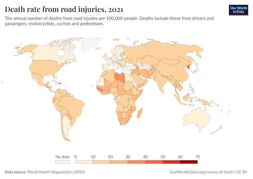 World Health Organization (2024) – with major processing by Our World in Data. “Death rate from road injuries” [dataset]. World Health Organization, “Global Health Estimates” [original data]. Retrieved January 8, 2026 from https://multi-dim-redirects-index.owid.pages.dev/grapher/death-rate-from-road-accidents-ghe
