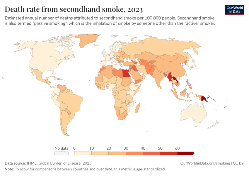 IHME, Global Burden of Disease (2024) – with minor processing by Our World in Data. “Death rate from secondhand smoke” [dataset]. IHME, Global Burden of Disease, “Global Burden of Disease - Risk Factors” [original data]. Retrieved January 8, 2026 from https://multi-dim-redirects-index.owid.pages.dev/grapher/death-rate-from-secondhand-smoke