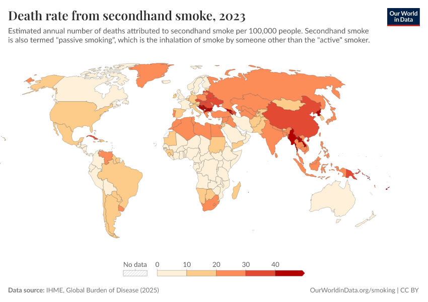 IHME, Global Burden of Disease (2024) – with minor processing by Our World in Data. “Death rate from secondhand smoke” [dataset]. IHME, Global Burden of Disease, “Global Burden of Disease - Risk Factors” [original data]. Retrieved January 8, 2026 from https://multi-dim-redirects-index.owid.pages.dev/grapher/death-rate-from-secondhand-smoke-gbd