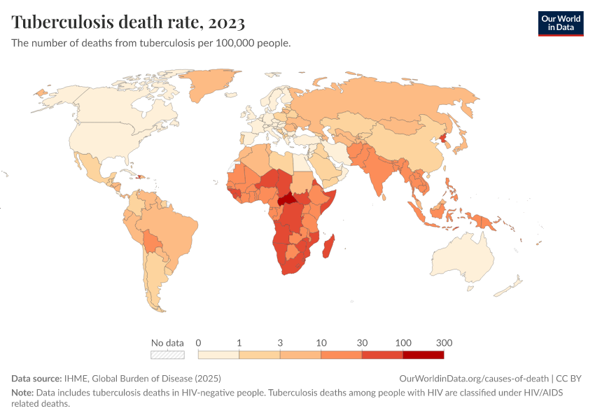 IHME, Global Burden of Disease (2024) – with minor processing by Our World in Data. “Tuberculosis death rate” [dataset]. IHME, Global Burden of Disease, “Global Burden of Disease - Deaths and DALYs” [original data]. Retrieved January 8, 2026 from https://multi-dim-redirects-index.owid.pages.dev/grapher/death-rate-from-tuberculosis-gbd