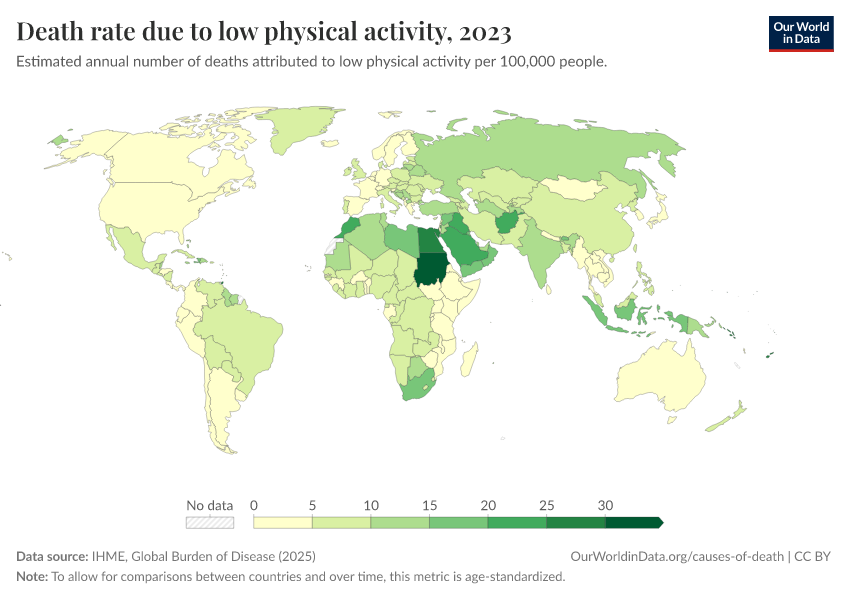 “Data Page: Death rate due to low physical activity”, part of the following publication: Esteban Ortiz-Ospina and Max Roser (2016) - “Global Health”. Data adapted from IHME, Global Burden of Disease. Retrieved from https://multi-dim-redirects-index.owid.pages.dev/grapher/death-rates-due-to-low-physical-activity [online resource]How to cite this data