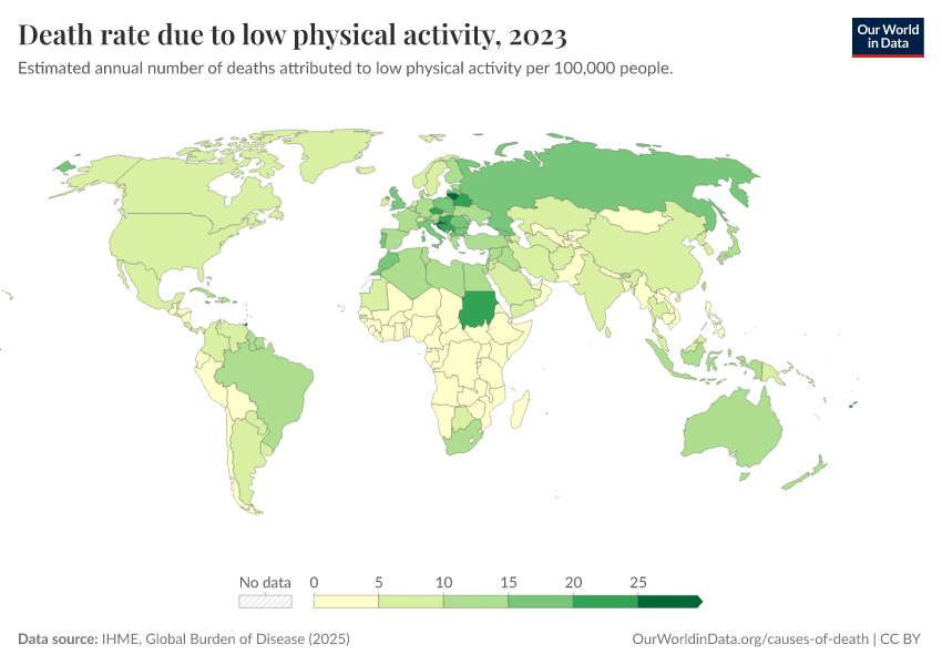“Data Page: Death rate due to low physical activity”, part of the following publication: Esteban Ortiz-Ospina and Max Roser (2016) - “Global Health”. Data adapted from IHME, Global Burden of Disease. Retrieved from https://multi-dim-redirects-index.owid.pages.dev/grapher/death-rates-due-to-low-physical-activity-gbd [online resource]How to cite this data