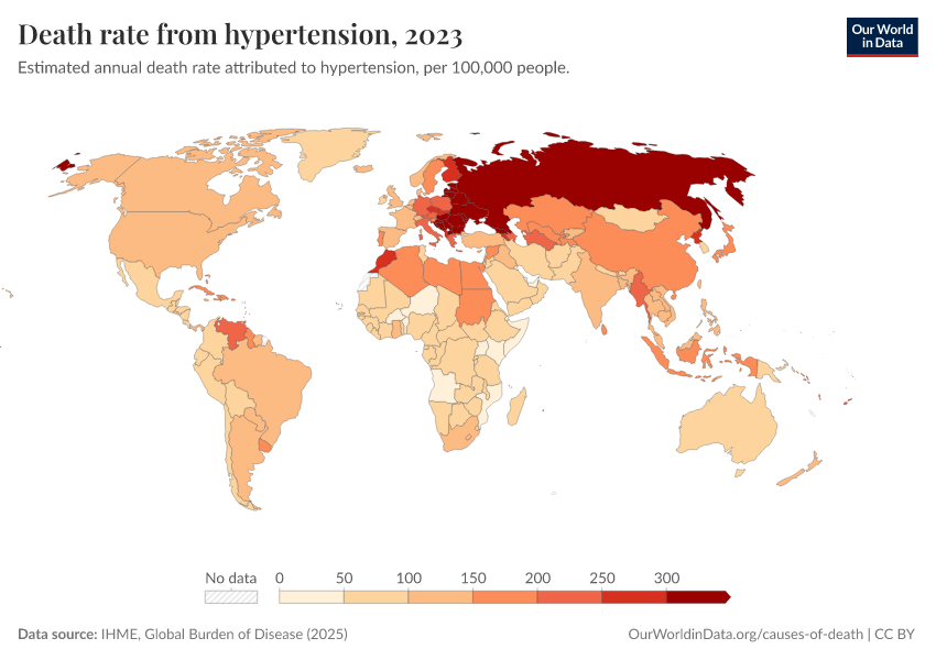 IHME, Global Burden of Disease (2024) – with minor processing by Our World in Data. “Death rate from hypertension” [dataset]. IHME, Global Burden of Disease, “Global Burden of Disease - Risk Factors” [original data]. Retrieved January 8, 2026 from https://multi-dim-redirects-index.owid.pages.dev/grapher/death-rates-from-high-blood-pressure-gbd