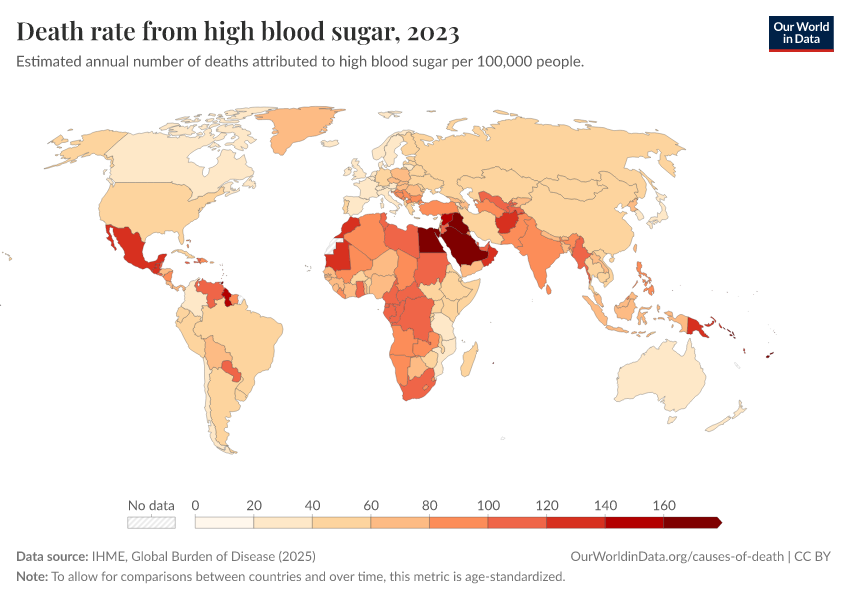 IHME, Global Burden of Disease (2024) – with minor processing by Our World in Data. “Death rate from high blood sugar” [dataset]. IHME, Global Burden of Disease, “Global Burden of Disease - Risk Factors” [original data]. Retrieved January 8, 2026 from https://multi-dim-redirects-index.owid.pages.dev/grapher/death-rates-from-high-blood-sugar