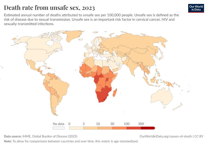 IHME, Global Burden of Disease (2024) – with minor processing by Our World in Data. “Death rate from unsafe sex” [dataset]. IHME, Global Burden of Disease, “Global Burden of Disease - Risk Factors” [original data]. Retrieved January 8, 2026 from https://multi-dim-redirects-index.owid.pages.dev/grapher/death-rates-from-unsafe-sex