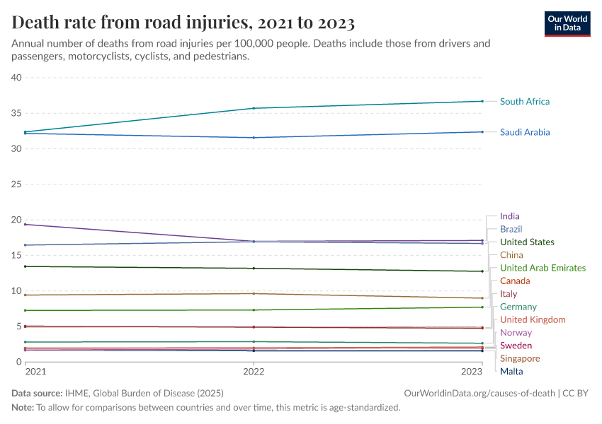 IHME, Global Burden of Disease (2024) – with minor processing by Our World in Data. “Death rate from road injuries” [dataset]. IHME, Global Burden of Disease, “Global Burden of Disease - Deaths and DALYs” [original data]. Retrieved January 8, 2026 from https://multi-dim-redirects-index.owid.pages.dev/grapher/death-rates-road-incidents