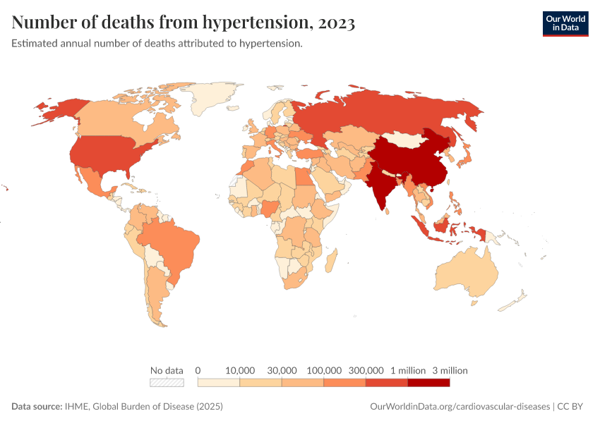 IHME, Global Burden of Disease (2024) – with minor processing by Our World in Data. “Number of deaths from hypertension” [dataset]. IHME, Global Burden of Disease, “Global Burden of Disease - Risk Factors” [original data]. Retrieved January 8, 2026 from https://multi-dim-redirects-index.owid.pages.dev/grapher/deaths-due-to-high-blood-pressure