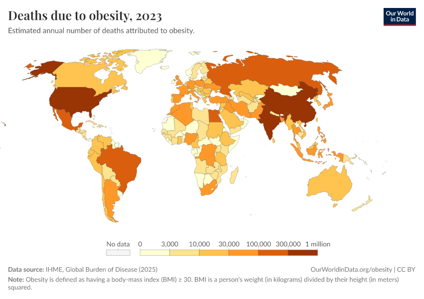 IHME, Global Burden of Disease (2024) – with minor processing by Our World in Data. “Deaths due to obesity” [dataset]. IHME, Global Burden of Disease, “Global Burden of Disease - Risk Factors” [original data]. Retrieved January 8, 2026 from https://multi-dim-redirects-index.owid.pages.dev/grapher/deaths-due-to-obesity