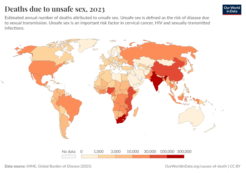 IHME, Global Burden of Disease (2024) – with minor processing by Our World in Data. “Deaths due to unsafe sex” [dataset]. IHME, Global Burden of Disease, “Global Burden of Disease - Risk Factors” [original data]. Retrieved January 8, 2026 from https://multi-dim-redirects-index.owid.pages.dev/grapher/deaths-due-to-unsafe-sex