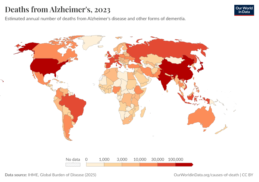 IHME, Global Burden of Disease (2024) – with minor processing by Our World in Data. “Deaths from Alzheimer's” [dataset]. IHME, Global Burden of Disease, “Global Burden of Disease - Deaths and DALYs” [original data]. Retrieved January 8, 2026 from https://multi-dim-redirects-index.owid.pages.dev/grapher/deaths-from-alzheimers
