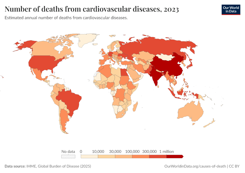IHME, Global Burden of Disease (2024) – with minor processing by Our World in Data. “Number of deaths from cardiovascular diseases” [dataset]. IHME, Global Burden of Disease, “Global Burden of Disease - Deaths and DALYs” [original data]. Retrieved January 8, 2026 from https://multi-dim-redirects-index.owid.pages.dev/grapher/deaths-from-cardiovascular-disease