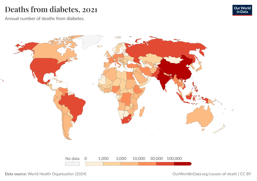 “Data Page: Deaths from diabetes”, part of the following publication: Esteban Ortiz-Ospina and Max Roser (2016) - “Global Health”. Data adapted from World Health Organization. Retrieved from https://multi-dim-redirects-index.owid.pages.dev/grapher/deaths-from-diabetes-ghe [online resource]How to cite this data