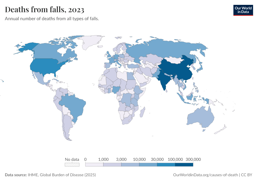 IHME, Global Burden of Disease (2024) – with minor processing by Our World in Data. “Deaths from falls” [dataset]. IHME, Global Burden of Disease, “Global Burden of Disease - Deaths and DALYs” [original data]. Retrieved January 8, 2026 from https://multi-dim-redirects-index.owid.pages.dev/grapher/deaths-from-falls-gbd