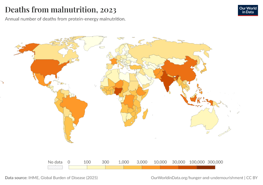 IHME, Global Burden of Disease (2024) – with minor processing by Our World in Data. “Deaths from malnutrition” [dataset]. IHME, Global Burden of Disease, “Global Burden of Disease - Deaths and DALYs” [original data]. Retrieved January 8, 2026 from https://multi-dim-redirects-index.owid.pages.dev/grapher/deaths-from-malnutrition