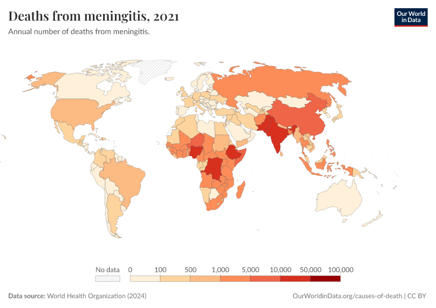 “Data Page: Deaths from meningitis”, part of the following publication: Esteban Ortiz-Ospina and Max Roser (2016) - “Global Health”. Data adapted from World Health Organization. Retrieved from https://multi-dim-redirects-index.owid.pages.dev/grapher/deaths-from-meningitis-ghe [online resource]How to cite this data