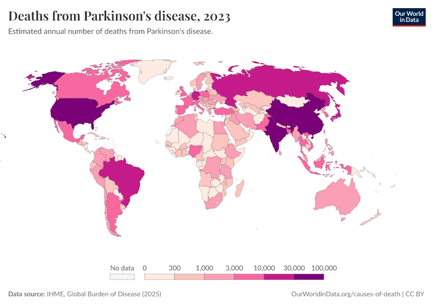IHME, Global Burden of Disease (2024) – with minor processing by Our World in Data. “Deaths from Parkinson's disease” [dataset]. IHME, Global Burden of Disease, “Global Burden of Disease - Deaths and DALYs” [original data]. Retrieved January 8, 2026 from https://multi-dim-redirects-index.owid.pages.dev/grapher/deaths-from-parkinsons-disease