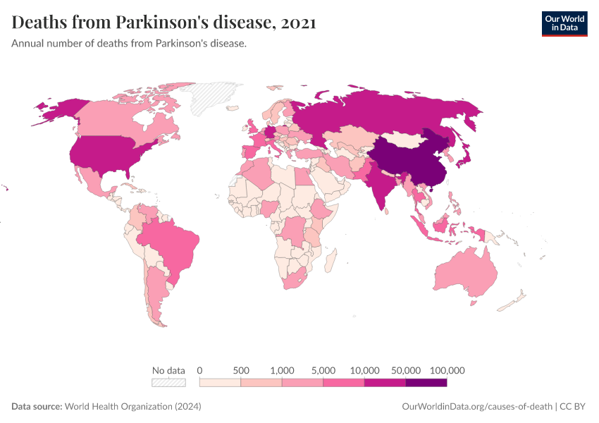 World Health Organization (2024) – with major processing by Our World in Data. “Deaths from Parkinson's disease” [dataset]. World Health Organization, “Global Health Estimates” [original data]. Retrieved January 8, 2026 from https://multi-dim-redirects-index.owid.pages.dev/grapher/deaths-from-parkinsons-disease-ghe