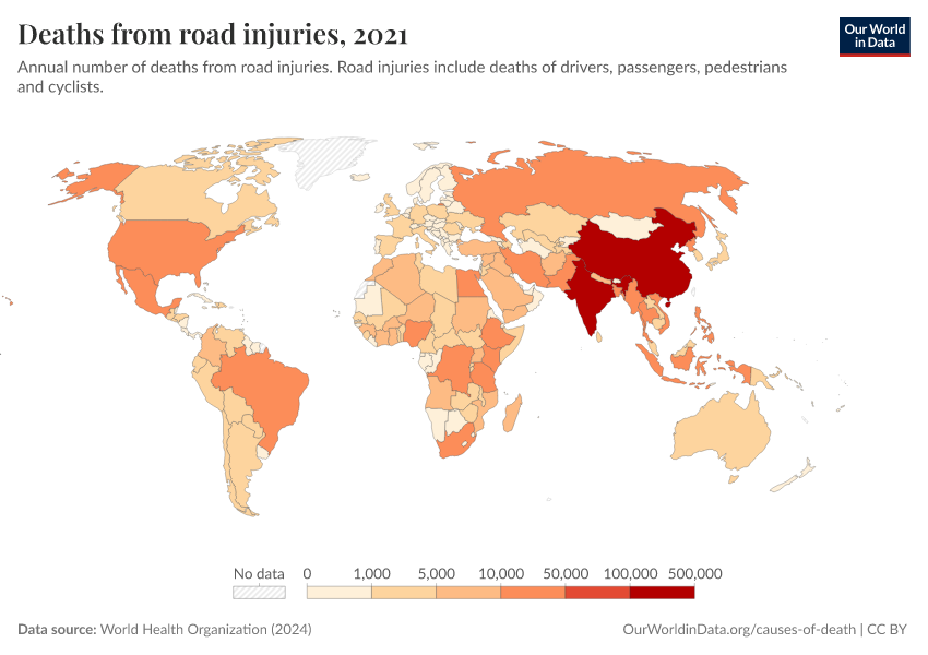 World Health Organization (2024) – with major processing by Our World in Data. “Deaths from road injuries” [dataset]. World Health Organization, “Global Health Estimates” [original data]. Retrieved January 8, 2026 from https://multi-dim-redirects-index.owid.pages.dev/grapher/deaths-from-road-injuries