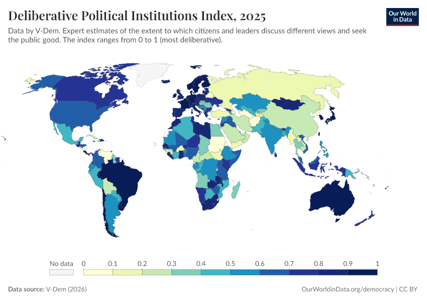 V-Dem (2025) – processed by Our World in Data. “Deliberative political institutions index – V-Dem” [dataset]. V-Dem, “Democracy report v15” [original data]. Retrieved January 8, 2026 from https://multi-dim-redirects-index.owid.pages.dev/grapher/deliberative-political-institutions-index