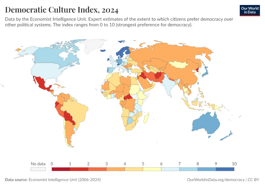 Economist Intelligence Unit (2006-2024) – processed by Our World in Data. “Democratic Culture Index” [dataset]. Economist Intelligence Unit, “Democracy Index 2021: The China challenge”; Economist Intelligence Unit, “Democracy Index 2022: Frontline democracy and the battle for Ukraine”; Economist Intelligence Unit, “Democracy Index 2023: Age of Conflict”; Economist Intelligence Unit, “Democracy Index 2024: What's wrong with representative democracy?”; Gapminder, “Democracy Index v4”; Various sources, “Population” [original data]. Retrieved January 8, 2026 from https://multi-dim-redirects-index.owid.pages.dev/grapher/democratic-culture-index-eiu