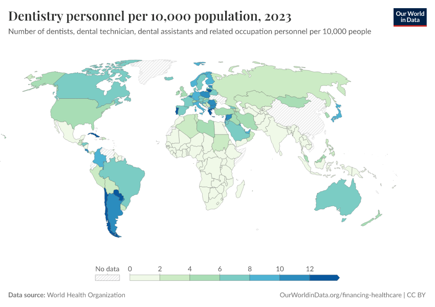 “Data Page: Dentistry personnel per 10,000 population”. Our World in Data (2026). Data adapted from World Health Organization. Retrieved from https://multi-dim-redirects-index.owid.pages.dev/grapher/dentistry-personnel-per-1000 [online resource]How to cite this data