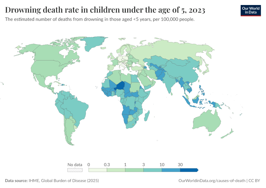 IHME, Global Burden of Disease (2024) – with minor processing by Our World in Data. “Drowning death rate in children under the age of 5” [dataset]. IHME, Global Burden of Disease, “Global Burden of Disease - Deaths and DALYs” [original data]. Retrieved January 8, 2026 from https://multi-dim-redirects-index.owid.pages.dev/grapher/drowning-death-rates-under-5