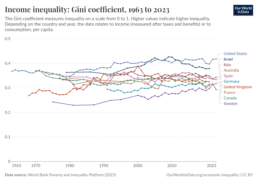 World Bank Poverty and Inequality Platform (2025) – with major processing by Our World in Data. “Income inequality: Gini coefficient – World Bank” [dataset]. World Bank Poverty and Inequality Platform, “World Bank Poverty and Inequality Platform (PIP) 20250930_2021, 20250930_2017” [original data]. Retrieved January 8, 2026 from https://multi-dim-redirects-index.owid.pages.dev/grapher/economic-inequality-gini-index
