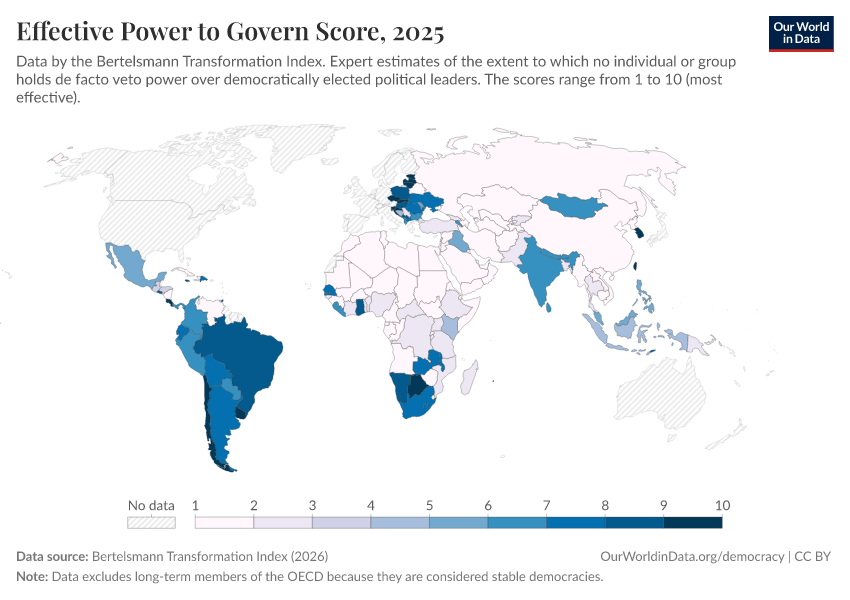 “Data Page: Effective power to govern score”, part of the following publication: Bastian Herre, Lucas Rodés-Guirao, and Esteban Ortiz-Ospina (2013) - “Democracy”. Data adapted from Bertelsmann Transformation Index. Retrieved from https://multi-dim-redirects-index.owid.pages.dev/grapher/effective-power-to-govern-score-bti [online resource]How to cite this data