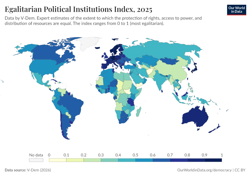 V-Dem (2025) – processed by Our World in Data. “Egalitarian political institutions index – V-Dem” [dataset]. V-Dem, “Democracy report v15” [original data]. Retrieved January 8, 2026 from https://multi-dim-redirects-index.owid.pages.dev/grapher/egalitarian-political-institutions-index