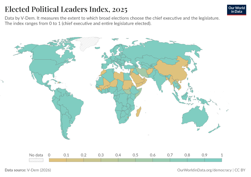 V-Dem (2025) – processed by Our World in Data. “Elected officials index” [dataset]. V-Dem, “Democracy report v15” [original data]. Retrieved January 8, 2026 from https://multi-dim-redirects-index.owid.pages.dev/grapher/elected-political-leaders-index