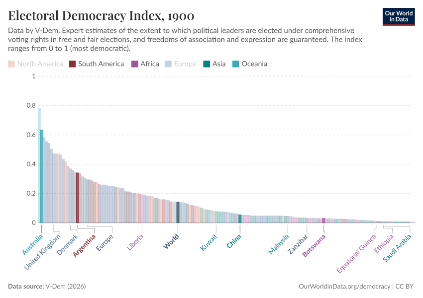 “Data Page: Electoral democracy index”, part of the following publication: Bastian Herre, Lucas Rodés-Guirao, and Esteban Ortiz-Ospina (2013) - “Democracy”. Data adapted from V-Dem. Retrieved from https://multi-dim-redirects-index.owid.pages.dev/grapher/electoral-democracy-index [online resource]