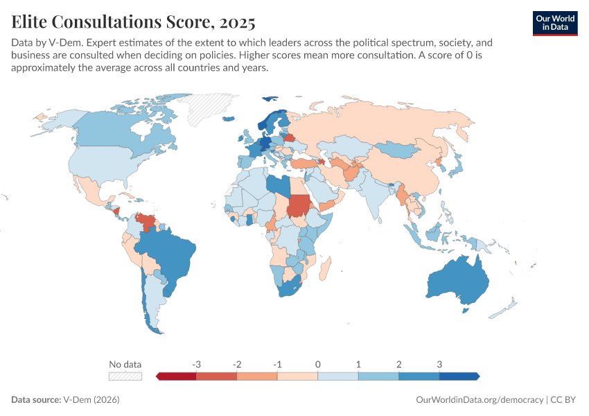 V-Dem (2025) – processed by Our World in Data. “Elite consultation – V-Dem” [dataset]. V-Dem, “Democracy report v15” [original data]. Retrieved January 8, 2026 from https://multi-dim-redirects-index.owid.pages.dev/grapher/elite-consultations-score