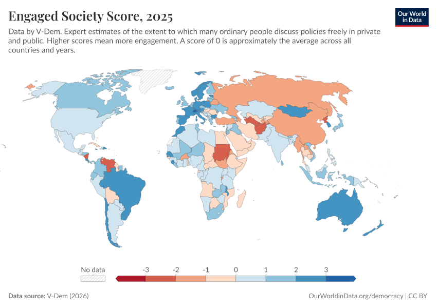 V-Dem (2025) – processed by Our World in Data. “Engaged society – V-Dem” [dataset]. V-Dem, “Democracy report v15” [original data]. Retrieved January 8, 2026 from https://multi-dim-redirects-index.owid.pages.dev/grapher/engaged-society-score