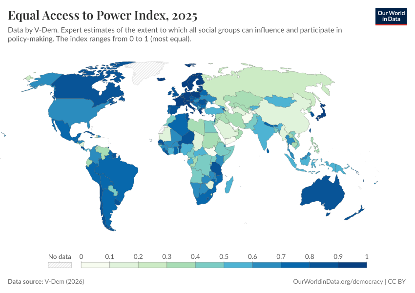“Data Page: Equal access to power index”, part of the following publication: Bastian Herre, Lucas Rodés-Guirao, and Esteban Ortiz-Ospina (2013) - “Democracy”. Data adapted from V-Dem. Retrieved from https://multi-dim-redirects-index.owid.pages.dev/grapher/equal-access-to-power-index [online resource]How to cite this data