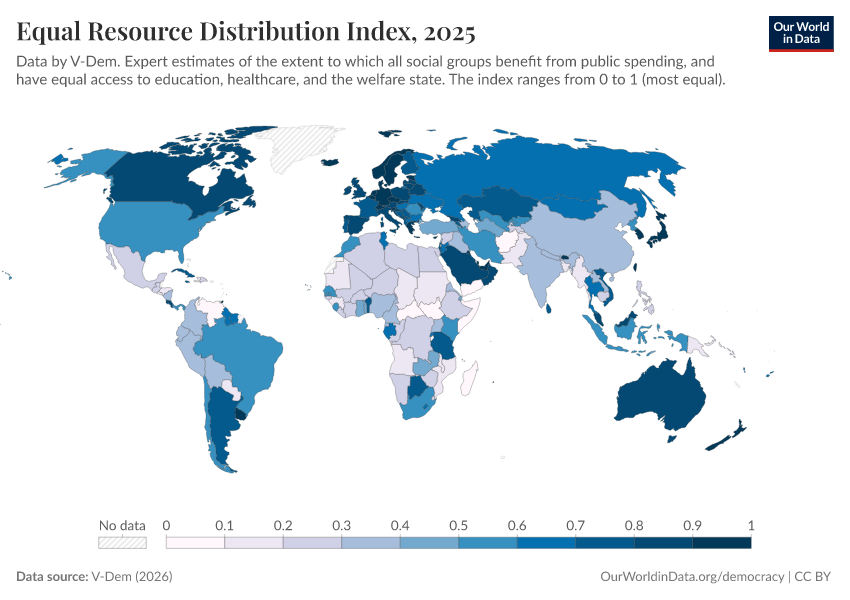 V-Dem (2025) – processed by Our World in Data. “Equal resource distribution index – V-Dem” [dataset]. V-Dem, “Democracy report v15” [original data]. Retrieved January 8, 2026 from https://multi-dim-redirects-index.owid.pages.dev/grapher/equal-resource-distribution-index