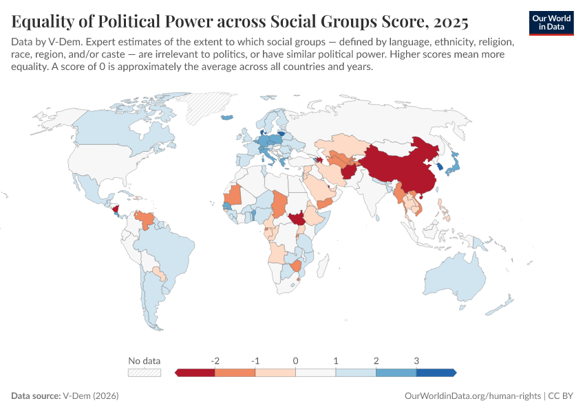 “Data Page: Equality of political power across social groups”, part of the following publication: Bastian Herre, Lucas Rodés-Guirao, and Esteban Ortiz-Ospina (2013) - “Democracy”. Data adapted from V-Dem. Retrieved from https://multi-dim-redirects-index.owid.pages.dev/grapher/equality-of-political-power-across-social-groups-score [online resource]How to cite this data