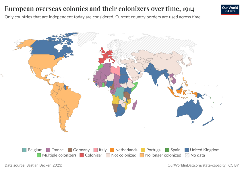 “Data Page: European overseas colonies and their colonizers over time”, part of the following publication: Bastian Herre and Pablo Arriagada (2023) - “State Capacity”. Data adapted from Bastian Becker. Retrieved from https://multi-dim-redirects-index.owid.pages.dev/grapher/european-overseas-colonies-and-their-colonizers [online resource]How to cite this data