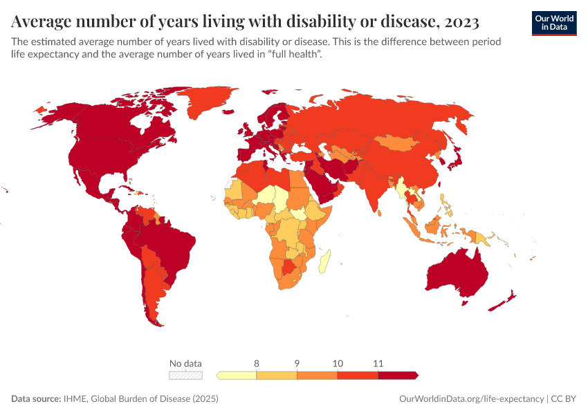 “Data Page: Average number of years living with disability or disease”, part of the following publication: Saloni Dattani, Lucas Rodés-Guirao, Hannah Ritchie, Esteban Ortiz-Ospina, and Max Roser (2023) - “Life Expectancy”. Data adapted from IHME, Global Burden of Disease. Retrieved from https://multi-dim-redirects-index.owid.pages.dev/grapher/expected-years-of-living-with-disability-or-disease-burden [online resource]How to cite this data