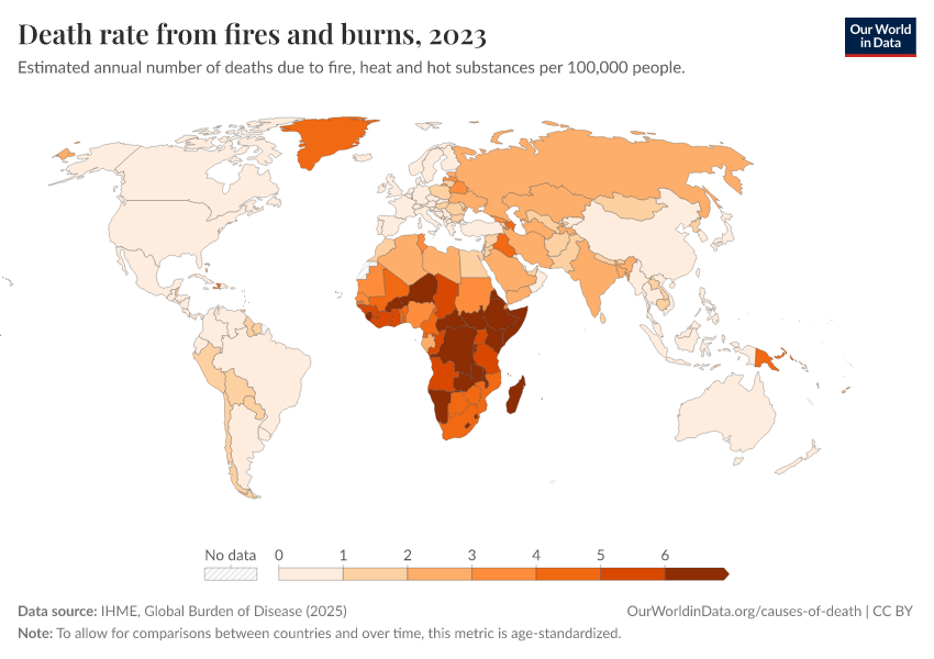 IHME, Global Burden of Disease (2024) – with minor processing by Our World in Data. “Death rate from fires and burns” [dataset]. IHME, Global Burden of Disease, “Global Burden of Disease - Deaths and DALYs” [original data]. Retrieved January 8, 2026 from https://multi-dim-redirects-index.owid.pages.dev/grapher/fire-death-rates