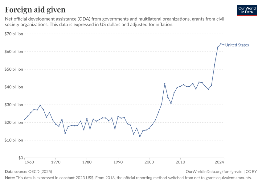OECD (2025) – with major processing by Our World in Data. “Foreign aid given – Net disbursements” [dataset]. OECD, “OECD Official Development Assistance (ODA) - DAC1: Flows by provider (ODA+OOF+Private)”; OECD, “OECD Official Development Assistance (ODA) - DAC2A: Aid (ODA) disbursements to countries and regions” [original data]. Retrieved January 8, 2026 from https://multi-dim-redirects-index.owid.pages.dev/grapher/foreign-aid-given-net