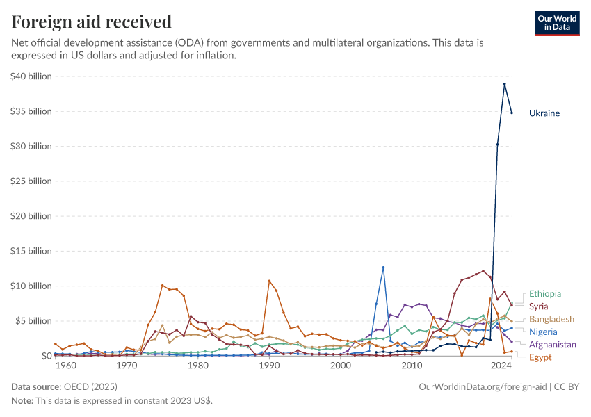 OECD (2025) – with minor processing by Our World in Data. “Foreign aid received – Official donors” [dataset]. OECD, “OECD Official Development Assistance (ODA) - DAC2A: Aid (ODA) disbursements to countries and regions” [original data]. Retrieved January 8, 2026 from https://multi-dim-redirects-index.owid.pages.dev/grapher/foreign-aid-received-net