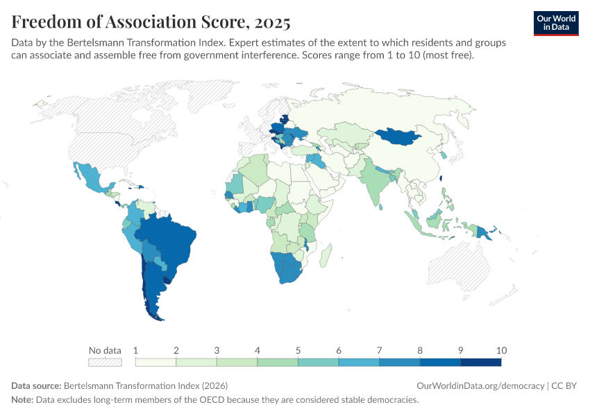 “Data Page: Freedom of association score”, part of the following publication: Bastian Herre, Lucas Rodés-Guirao, and Esteban Ortiz-Ospina (2013) - “Democracy”. Data adapted from Bertelsmann Transformation Index. Retrieved from https://multi-dim-redirects-index.owid.pages.dev/grapher/freedom-of-association-score-bti [online resource]How to cite this data