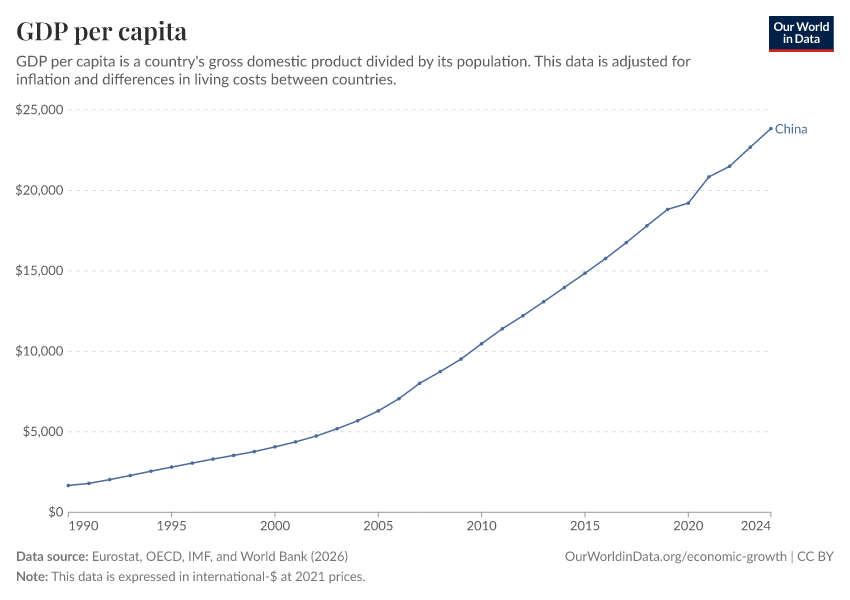 “Data Page: GDP per capita”, part of the following publication: Max Roser, Bertha Rohenkohl, Pablo Arriagada, Joe Hasell, Hannah Ritchie, and Esteban Ortiz-Ospina (2023) - “Economic Growth”. Data adapted from Eurostat, OECD, IMF, and World Bank. Retrieved from https://multi-dim-redirects-index.owid.pages.dev/grapher/gdp-per-capita-worldbank [online resource]How to cite this data