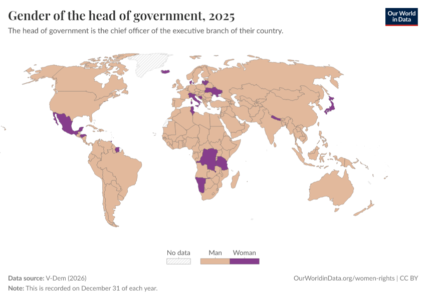 V-Dem (2025) – processed by Our World in Data. “Gender of the head of government” [dataset]. V-Dem, “Democracy report v15” [original data]. Retrieved January 8, 2026 from https://multi-dim-redirects-index.owid.pages.dev/grapher/gender-of-the-head-of-government