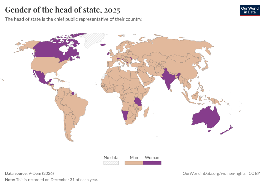 V-Dem (2025) – processed by Our World in Data. “Gender of the head of state” [dataset]. V-Dem, “Democracy report v15” [original data]. Retrieved January 8, 2026 from https://multi-dim-redirects-index.owid.pages.dev/grapher/gender-of-the-head-of-state